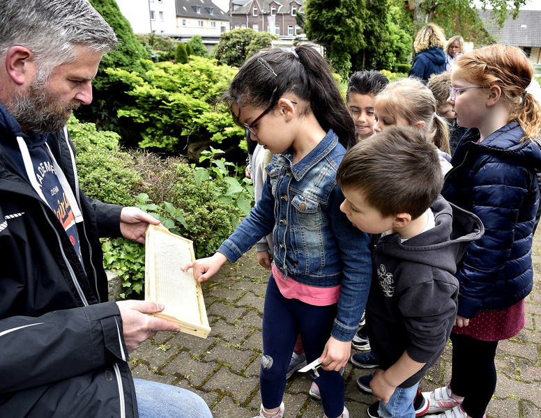 „Wo steht denn der Sarg?“, „Was passiert bei einer Trauerfeier?“- In der Kapelle des Friedhofs beantwortete Holger Sense die Fragen jungen Besucher*innen einfühlsam und informativ und erläuterte den „typischen“ Ablauf einer Beerdigung. Der offene Umgang mit allen Fragen und Erlebnissen des Tages, soll den Kindern dabei helfen ihre Sozial- und Bildungskompetenzen zu entwickeln. Der Ausflug sollte nicht nur Wissen vermitteln, sondern auch das Verständnis für verschiedene Lebensbereiche fördern.Zum Abschluss gab es dann noch ein besonderes Highlight: Beim Besuch der Bienenstöcke durfte frischer Honig direkt aus der Wabe probiert werden. Eine kleine Besucherin fasste den Ausflug mit Holger Sense kurz zusammen: „Heute war ein schöner Tag mit dir!“.