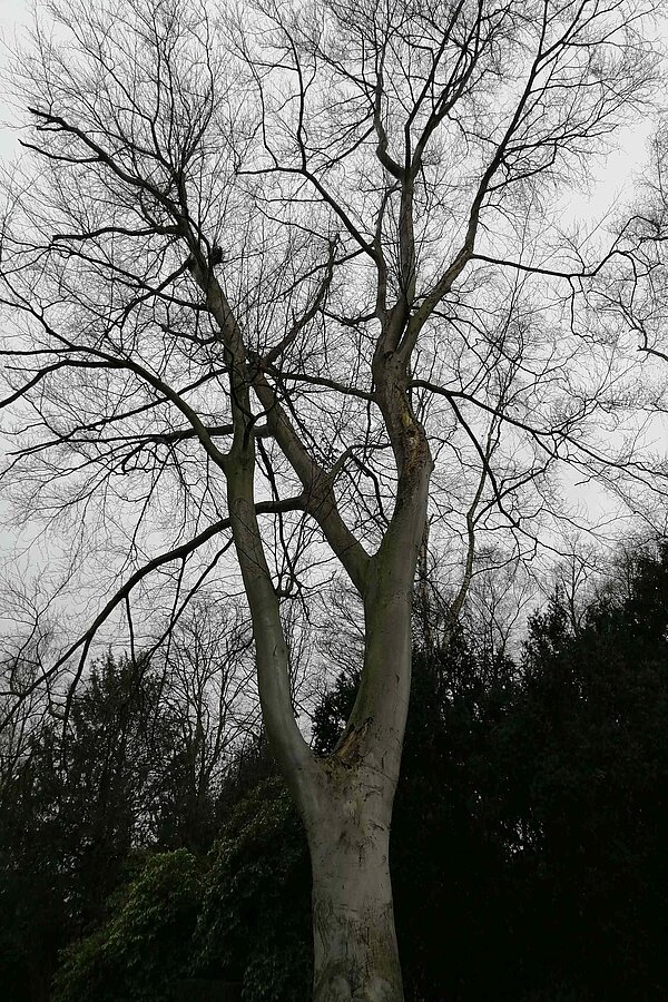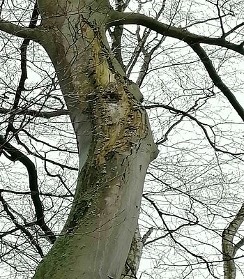 In Kürze werden wir eine alte Blutbuche auf Feld E, die Infolge einer länger zurück-liegenden Freistellung im Kronenbereich schwerstgeschädigt ist, auf ca. 9m über dem größeren Rindenschadenkappen müssen.
