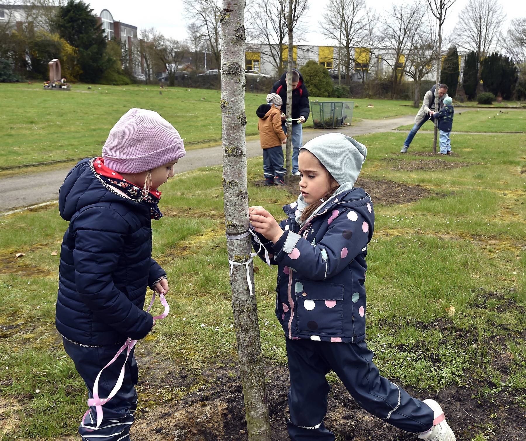 Fröhliche Kinderstimmen schallen über den Friedhof der katholischen Gemeinde Liebfrauen in Bochum – Linden. Mia und Emilia sind gemeinsam mit 15 weiteren Kindern aus der nahegelegenen Kita gekommen um bunte Schleifen um die Stämme neu gepflanzter Bäume zu knüpfen.
