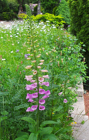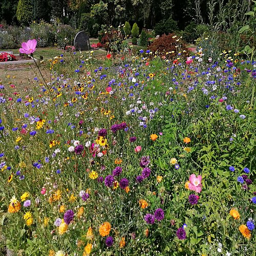 Jetzt blühen Margeriten, Ringelblumen, Spitzwegerich, Phacelia und Klee. An der ein oder anderen Stelle haben sich Pflanzen auch schon von alleine angesiedelt, wie z.B. der Fingerhut und Akkelei. Selten gewordene Käfer und Wildbienen haben eine neue Heimat auf dem Friedhof gefunden und nehmen das Angebot an.