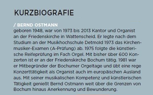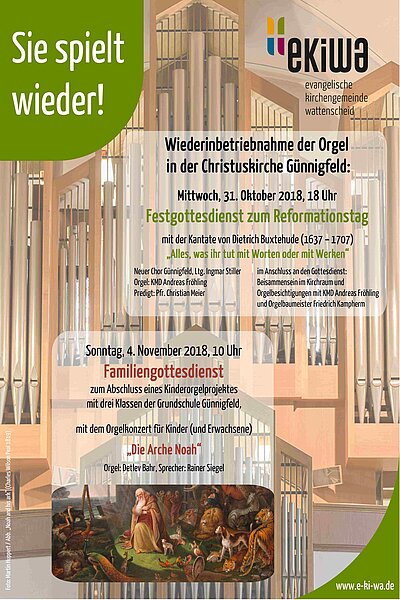 Aber nicht nur an diesem Abend steht die Orgel im Mittelpunkt. Zusammen mit der benachbarten Grundschule Günnigfeld organisiert die Gemeinde für drei Klassen eine Projektwoche zum Thema „Orgel und Töne“. Sie wird von Seiten der Gemeinde geleitet von Kirchenmusiker Detlev Bahr und dem Pädagogen Rainer Siegel, die zusammen viel Erfahrung in der musikalischen Arbeit mit Kindern haben. Gemeinsam werden Beide im Rahmen eines Familiengottesdienstes am Sonntag, 4. November (Beginn 10 Uhr) das Orgelkonzert "Die Arche Noah" für Kinder (und Erwachsene) vortragen. Darin wird die Geschichte der Arche nacherzählt und durch Orgelwerke von Johann Sebastian Bach eindrücklich untermalt. „Wir freuen uns auf alle, die sich auch an diesem Tag mit uns an unserer Orgel erfreuen.“ lädt Meier alle Interessierten in die Kirche in der Parkallee ein.