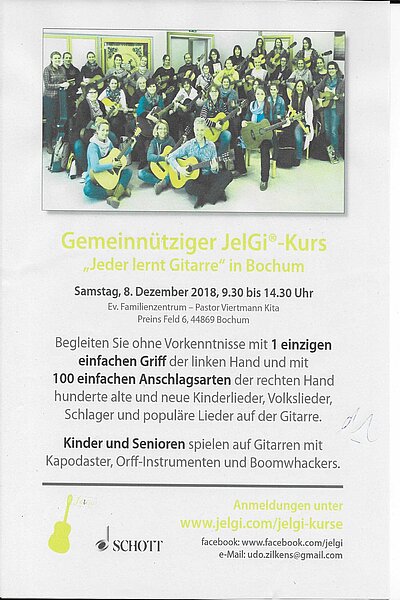 SAMSTAG 8. DEZEMBER 2018, 9.30-14.30 UHR: Gemeinnütziger JelGi Kurs - Jeder lernt Gitarre in Bochum -- Im Evangelischem Familienzentrum - Pastor Vietmann Kita, Preins Feld 6, 44869 Bochum