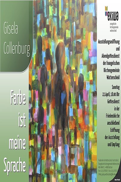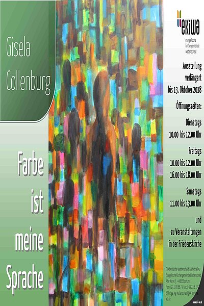 Die Ausstellung der bekannten Wattenscheider Künstlerin Gisela Collenburg in der Friedenskirche wird bis zum 13. Oktober verlängert.Eine wirklich gelungene Ausstellung – so urteilten zahlreiche Besucherinnen und Besucher der Friedenskirche inzwischen. Mit ihrer großen Ausdruckskraft und Farbintensität ziehen die Bilder von Gisela Collenburg die Menschen in ihren Bann. Die großflächigen Bilder kommen gerade in der Friedenskirche gut zur Geltung. Die Gemeinde freut sich und dankt Frau Collenburg für ihre Bereitschaft, die Bilder dort noch für einen längeren Zeitraum auszustellen. Öffnungszeiten: Dienstags, 10.00 bis 12.00 Uhr, Freitags, 10.00 bis 12.00 Uhr und 16.00 bis 18.00 Uhr, Samstags, 11.00 bis 13.00 Uhr und zu Veranstaltungen in der Kirche.