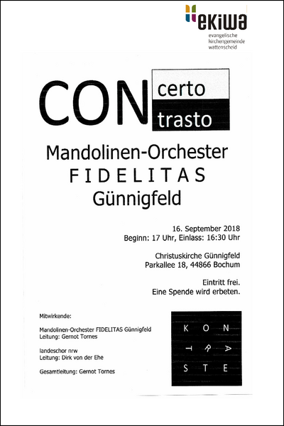 SONNTAG 16. SEPTEMBER 2018, 17 UHR, CHRISTUSKIRCHE GÜNNIGFELD : Gemeinschaftskonzert Mandolinen-Orchester "Fidelitas" mit dem "Landeschor NRW"