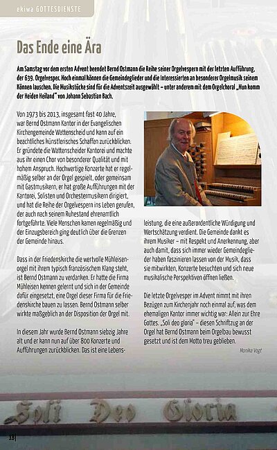 Aber nicht nur Orgelmusik wird an diesem Abend zu hören sein. Auch der Kirchenchor der Gemeinde beteiligt sich am Gottesdienst und trägt unter der Leitung von Ingmar Stiller eine kleine Kantate mit Instrumentalbegleitung vor.