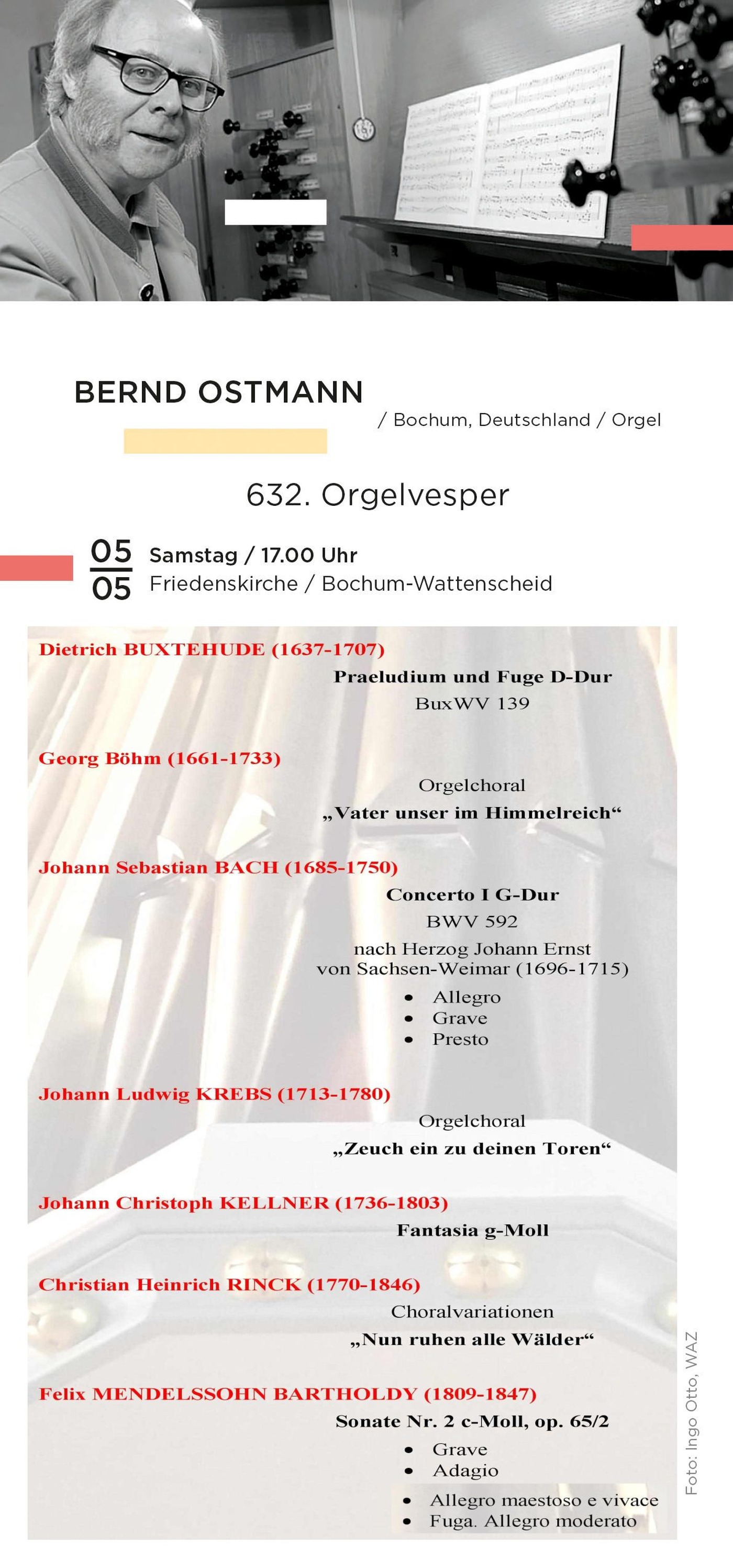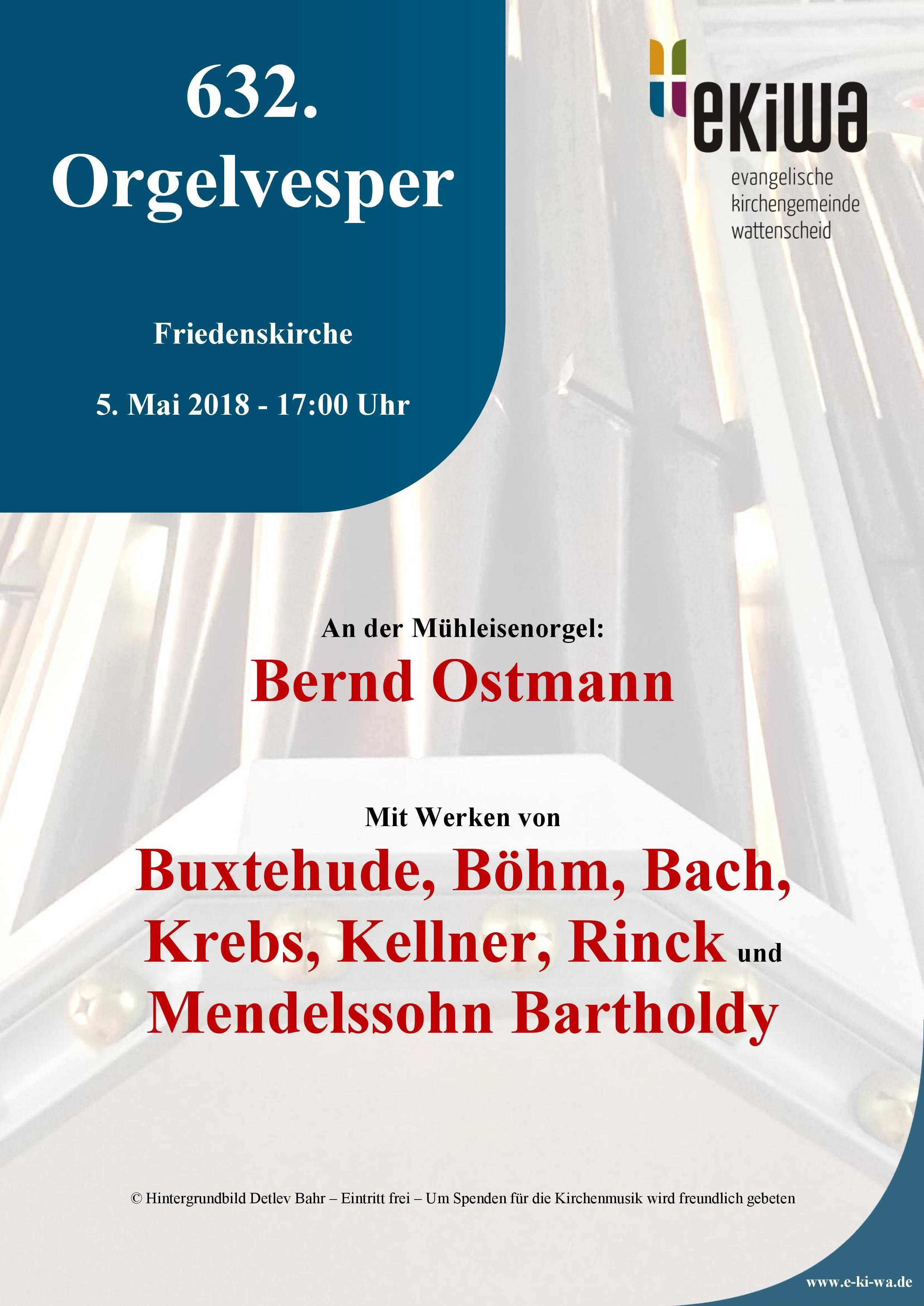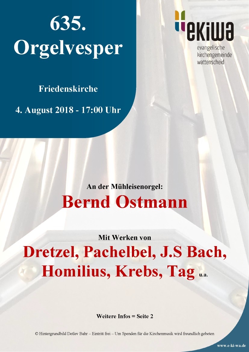 SAMSTAG 3. FEBRUAR 2018, 17.00 UHR: 629. Orgelvesper in der Friedenskirche