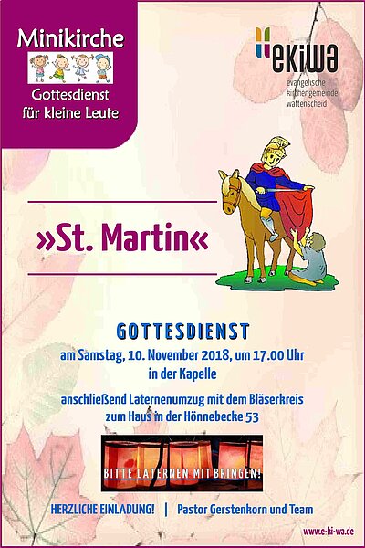 SAMSTAG, 10. NOVEMBER 2018, 17 UHR: Minikirche "Gottesdienst für kleine Leute" anschl St. Martin Laternenumzug - in der Kapelle, Höntroper Str. 35, 44869 BO-Wattenscheid-Höntrop
