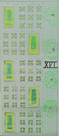 Vor den Urnen wird die Möglichkeit sein, Blumensträuße nieder zu legen. Die traditionellen Kissensteine, 40x40 cm, mit Vorname, Name, Geb.- und Sterbedatum werden hier mit eingebettet. Auf der Skizze ist dies durch die großen Rechtecke dargestellt.