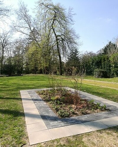 Vor der Stele besteht die Möglichkeit Blumen abzulegen, eine Kerze anzuzünden oder eine bepflanzte Schale hin zu stellen.