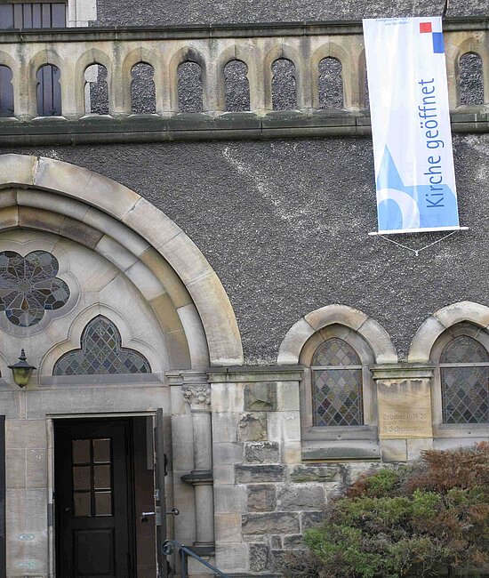 Samstags hängt das Banner mit dieser Aufschrift am Turm der Christuskirche. Eine von weitem sichtbare Einladung – von Gott und unserer Gemeinde: „Schaut her, die Tür steht offen. Ich bin für dich da, trete ein.“