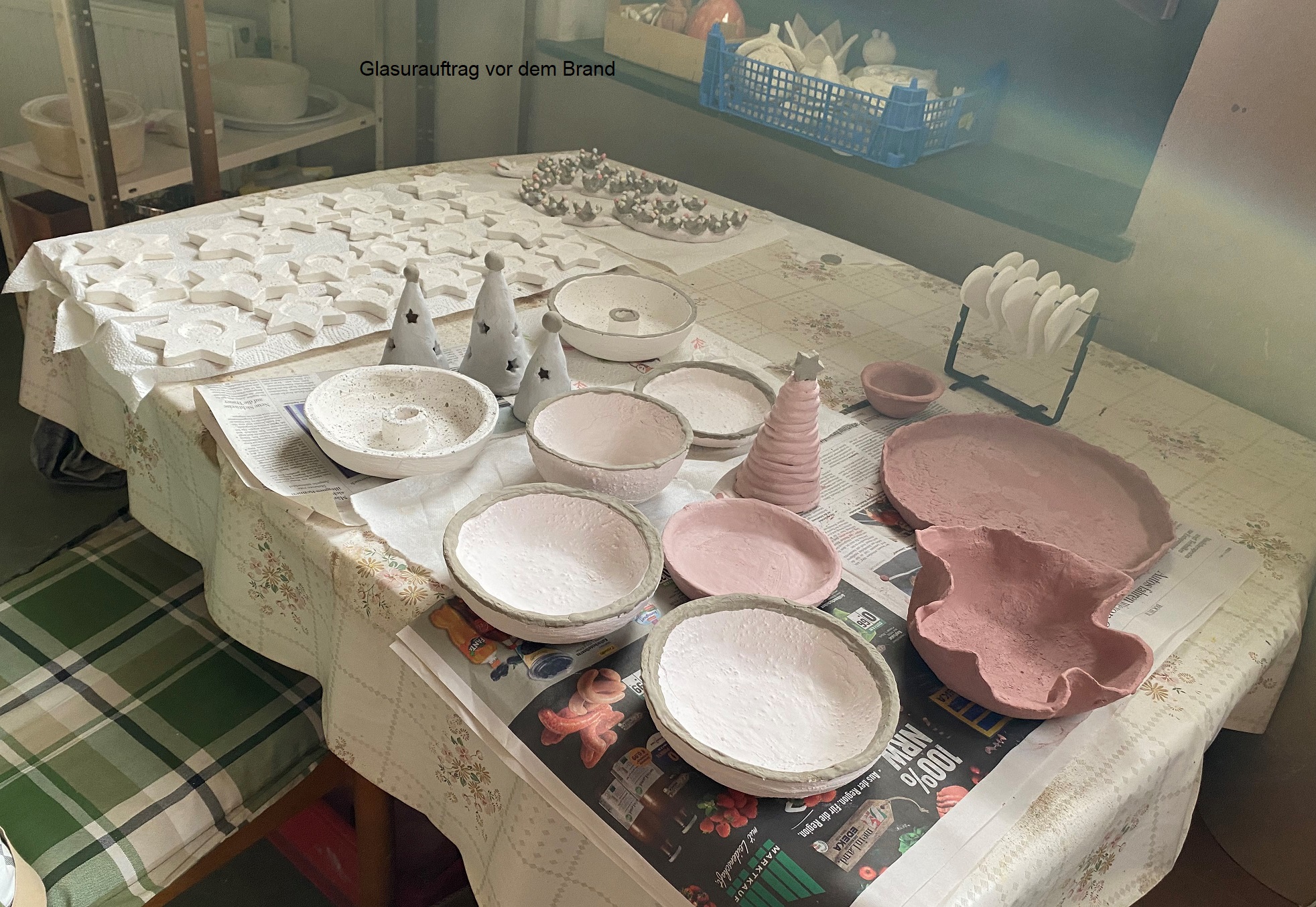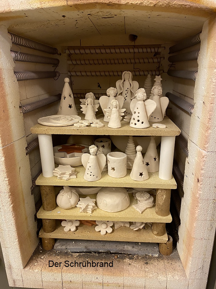 Nach Fertigstellung der Objekte werden diese nach einer gewissen Trockenzeit im Ofen gebrannt. Anschließend können die Arbeiten mit Farbe versehen und glasiert werden. Dies geschieht durch einen 2. Brennvorgang. Ein entscheidender Faktor für das Gelingen ist z. B. die Auftragsstärke der Glasur. Das kann durchaus sehr unterschiedlich sein bei verschiedenen Glasuren. So erfordert das Glasieren: dranbleiben und Erfahrungen sammeln. Wenn der Ofen nach diesem letzten Arbeitsschritt geöffnet wird, sind immer alle ganz gespannt wie die einzelnen Stücke geworden sind.