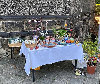 Für das Sommerfest und den Adventsbasar der Kirchengemeinde gestalten wir themenspezifische Keramiken, die zu diesen Veranstaltungen verkauft werden. Beim Adventsbasar werden neben den Tonwaren, wie nach jahrelanger Tradition üblich, auch Adventskränze und Gestecke gefertigt und angeboten. Der Verkaufserlös kommt der Kirchengemeinde zugute.