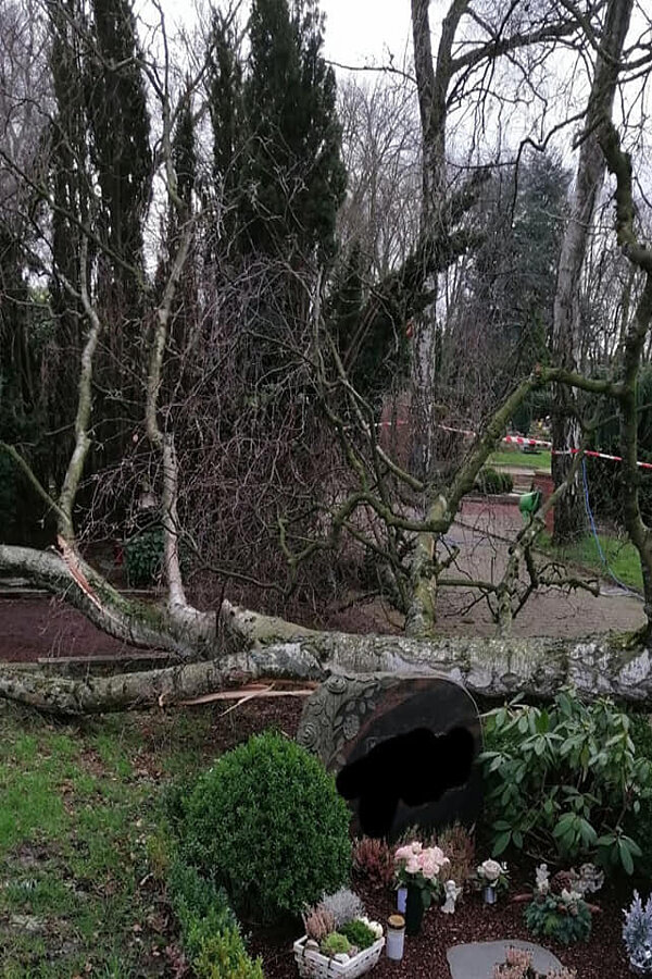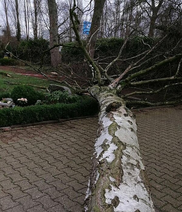 Der Friedhof musste für 3 Tage zur Sicherheit aller Besucher gesperrt werden. Am Dienstag letzter/vorletzter Woche hat der Sturm eine Birke so stark geschädigt, dass diese gefällt werden musste.