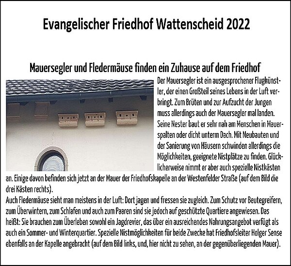 Der Friedhof der Ev. Kirchengemeinde Wattenscheid in Bochum an der Westenfelder Straße ist eine grüne Oase inmitten der dichten Wohnbebauung zwischen der Wattenscheider Innenstadt und dem Ruhrschnellweg (A 40). Daher hat er über die Funktion als Begräbnisstätte hinaus eine große Bedeutung für die Bevölkerung als Raum für Erholung und Begegnung. Er stellt außerdem einen wichtigen Lebensraum und Rückzugsort für Tiere und Pflanzen dar, die in der näheren Umgebung nur noch wenig Möglichkeiten zum Überleben finden. Seit einigen Jahren legt die Friedhofsverwaltung unter Leitung von Holger Sense großen Wert auf den ökologischen Ausbau des Geländes. Es wurden zahlreichen Flächen zu blühenden Inseln umfunktioniert, Blumenwiesen und insektenfreundliche Staudenbeete angelegt und eine hohe Anzahl unterschiedlicher Gehölze gepflanzt. So soll gewährleistet werden, dass es über den ganzen Friedhof verteilt immer auch etwas Blühendes für unsere bedrohte Insektenwelt gibt.
