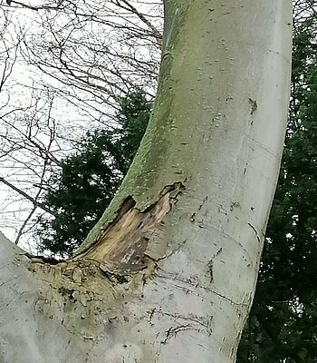 In Kürze werden wir eine alte Blutbuche auf Feld E, die Infolge einer länger zurück-liegenden Freistellung im Kronenbereich schwerstgeschädigt ist, auf ca. 9m über dem größeren Rindenschadenkappen müssen.