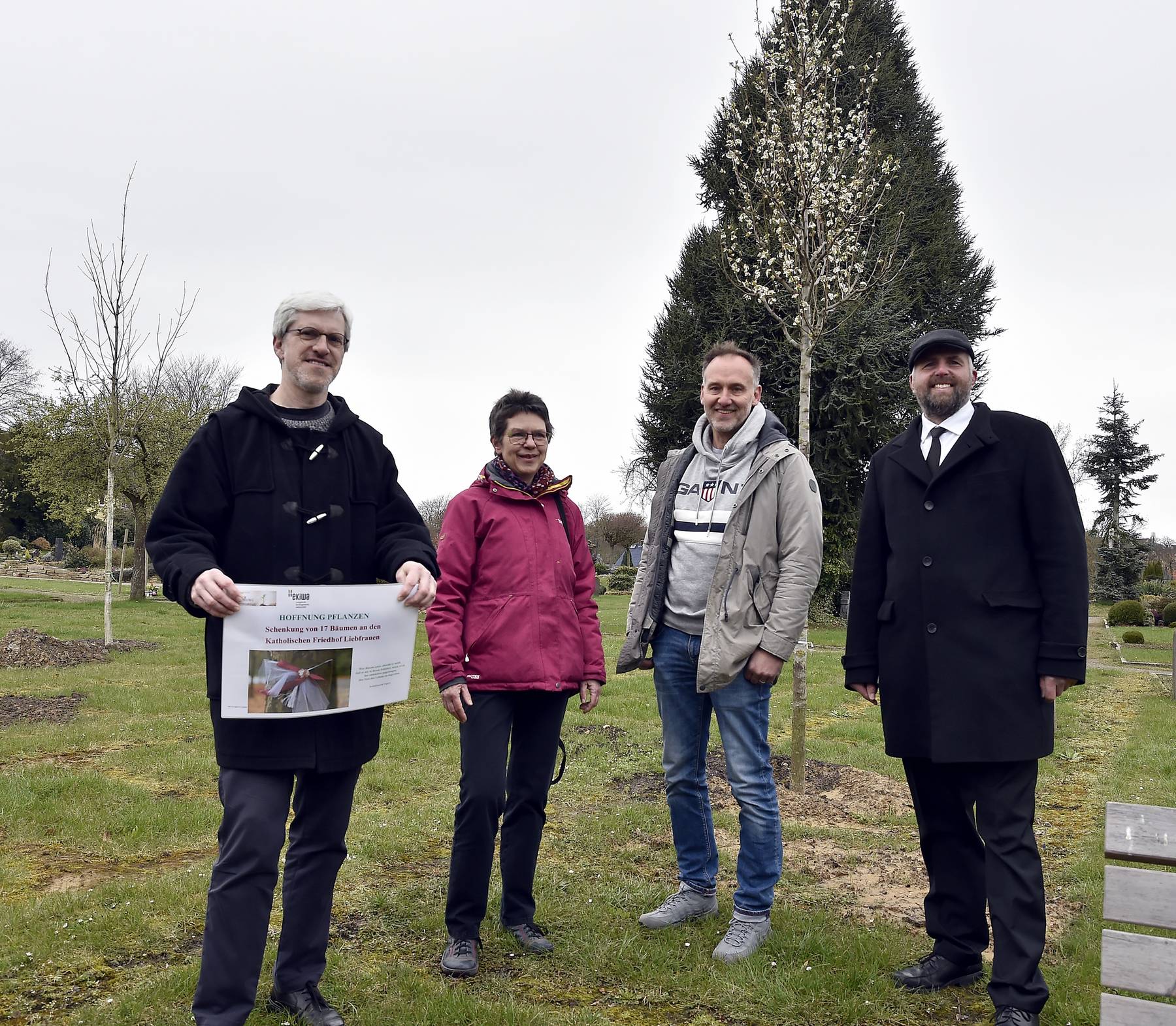 Diese ökumenisch – ökologische Kooperation wurde von den beiden Friedhofsverwaltern Holger Sense (rechts)und Jörg Iserlohn (Mitte) angestoßen. Pfarrerin Monika Vogt (evangelische Kirchengemeinde Wattenscheid) und Pfarrer Thomas Köster (katholische Kirchengemeinde Liebfrauen, links) freuen sich über die Baumspende.