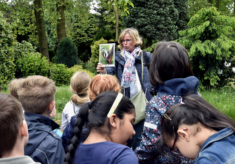 Dass neben dem Tod auch das Leben in verschiedenen Formen gehört, konnten die Kinder im Anschluss im „offenen Klassenzimmer“ mit Biologin Beate Groth-Thiem lernen. Hier hatten die Kinder die Möglichkeit, verschiedene Pflanzen, Blätter und Pilze zu betrachten und anzufassen und lernten etwas über die Flora und Fauna auf dem Friedhof. „Es ist wichtig Bewusstsein dafür zu schaffen, dass Friedhöfe nicht nur Orte des Gedenkens und der Ruhe sind, sondern auch eine bedeutende Rolle bei der Erhaltung der Biodiversität spielen. Sie bieten Lebensraum für eine Vielzahl von Pflanzen- und Tierarten und tragen somit zur Aufrechterhaltung der ökologischen Vielfalt bei“, kommentierte Holger Sense. Aufgrund einer kleinen Untersuchung weiß er beispielsweise, dass es allein auf dem Wattenscheider Friedhof über 100 Nachtfalterarten gibt - darunter auch seltene und bedrohte.