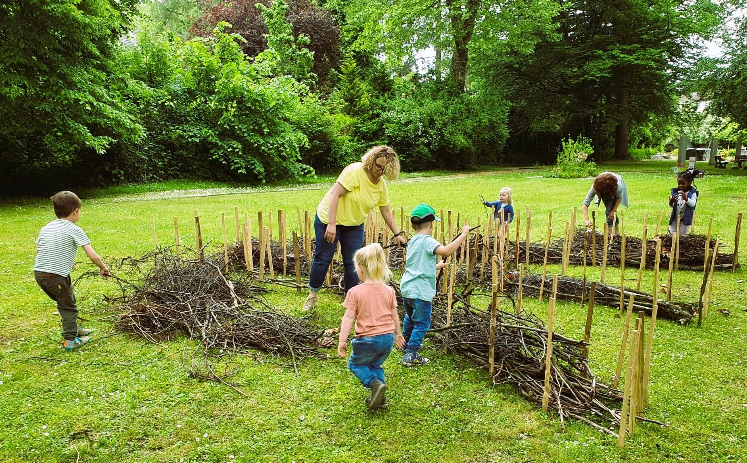 Unter Leitung von Holger Sense wurden von Kindern und Erzieherinnen aus dem Familienzentrum Harkortstraße und den Mitgliedern der „GartenfreundeWat“ die im Laufe der letzten Saison angefallenen Schnitthölzer verarbeitet.