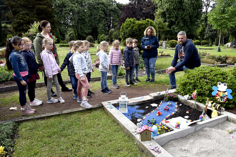 Gemeinsam mit ihren betreuenden Kindergärtnerinnen, Katja Kopp-Owerdieck und Andrea Stas, hatten die 15 Kinder die Möglichkeit, den Friedhof, der direkt an den Außenspielbereich des Familienzentrums angrenzt, zu entdecken. Die Aktion ermöglichte eine spielerische Annäherung an die Natur und die Bedeutung des Friedhofs als Ort des Gedenkens und der Ruhe – und der biologischen Vielfalt. Zudem war es eine einzigartige Gelegenheit, die Themen Tod und Trauer und die damit verbundenen Rituale kennenzulernen. Der Rundgang über den Friedhof begann mit einem Besuch der von den Kindern gepflanzten Bäume, die eine symbolische Verbindung zwischen der Kita und dem Friedhof darstellen. Von dort ging es zu dem vielleicht außergewöhnlichsten Grab auf dem Gelände: Spielzeug, bunt bemalte Steine, ein Regenbogen und ein Sandkasten finden sich auf der Ruhestätte des kleinen Dante: ein Wunsch seiner Eltern. Holger Sense, Leiter des Ev. Friedhofs in Wattenscheid, erklärte den Kindern dabei einfühlsam die Bedeutung und Gestaltung des Grabes.