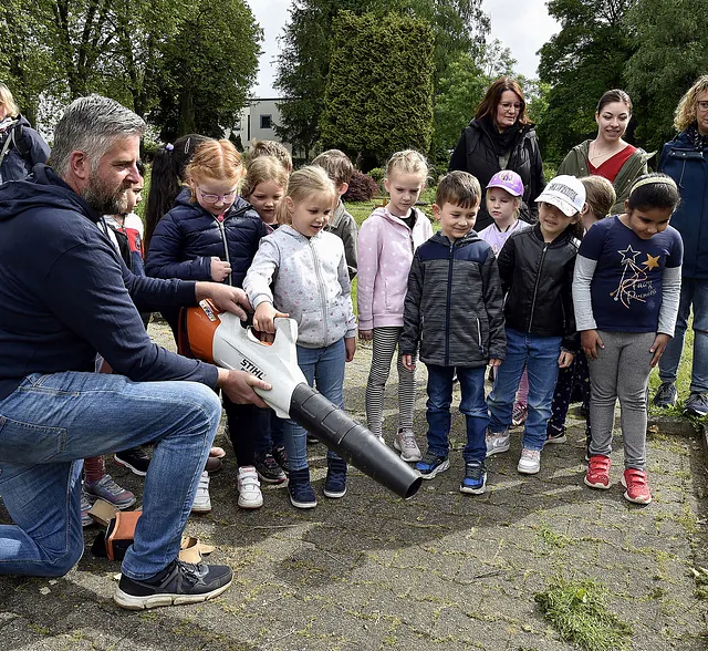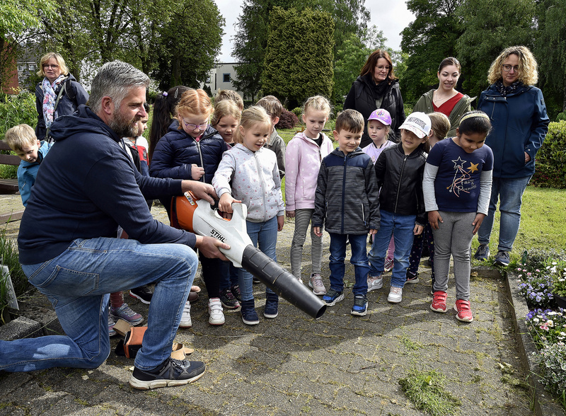 Aber auch Arbeit gehört zum Alltag auf dem Friedhof. Die jungen Entdecker*innen bekamen daher die Möglichkeit, große wie kleine Arbeitsgeräte zu bestaunen. Während der große Bagger nur angeschaut werden konnte, durften die Kinder den elektrischen Laubbläser einmal selbst bedienen und bekamen erklärt, wofür die verschiedenen Geräte auf dem Friedhof benötigt werden. Holger Sense führte die Kinder zu einem kürzlich mit dem Bagger ausgehobenen Grab und erklärte ihnen den Ablauf einer Beerdigung. Neugier aber auch Ehrfurcht vor der tief ausgehobenen Grabstätte war den Kindern anzumerken. Es sei aber wichtig, den Umgang mit Tod und Trauer nicht zu tabuisieren, sondern offen damit umzugehen und Fragen zu klären, so Holger Sense.
