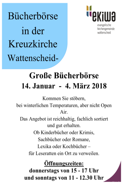 14.01.-04.03.2018 Evangelische Kirchengemeinde Wattenscheid lädt ein: zum Besuch des Büchertrödels in der Kreuzkirche