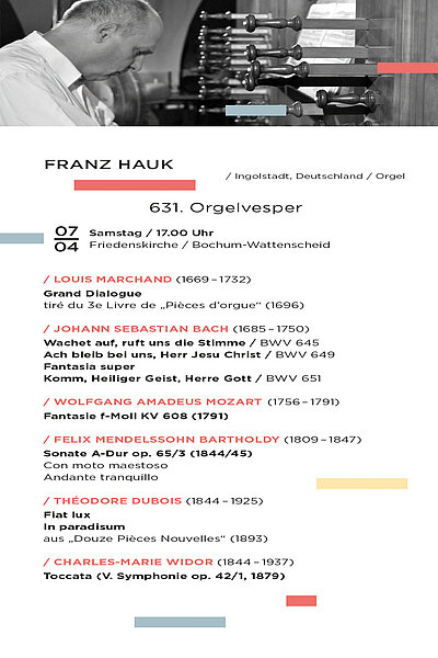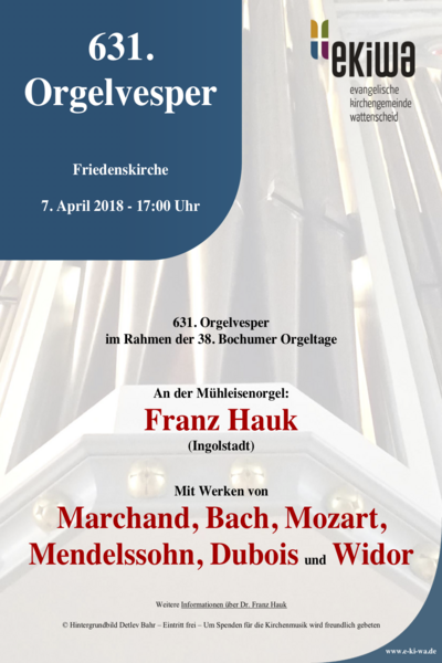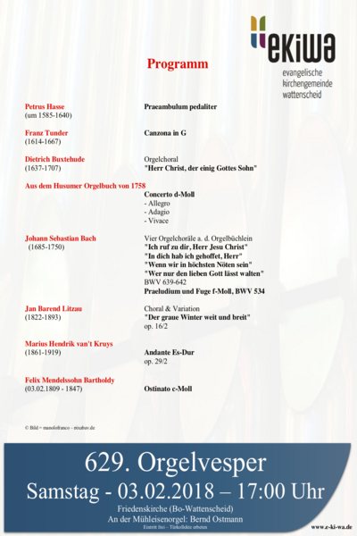 SAMSTAG 3. FEBRUAR 2018, 17.00 UHR: 629. Orgelvesper in der Friedenskirche