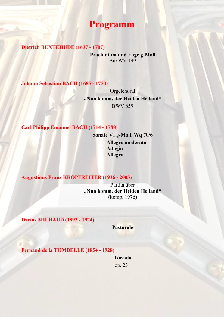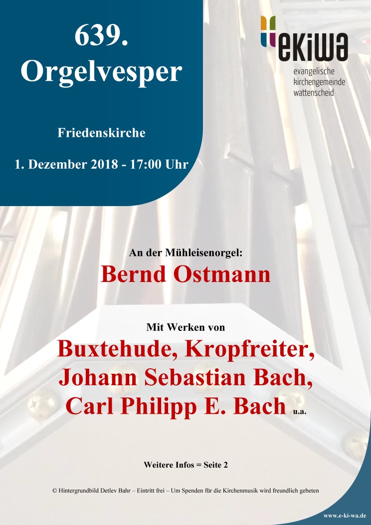 SAMSTAG 1. DEZEMBER 2018, 17.00 UHR: 639. ORGELVESPER - in der Friedenskirche, Hochstr. 2