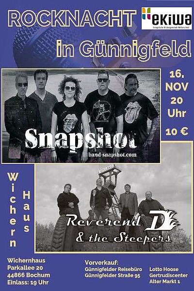 Die Rocknacht in Günnigfeld bietet zwei Bands aus dem Ruhrgebiet, ehrliche Rockmusik mit viel Spielfreude, ein Saal, wie geschaffen für Rock & Roll, ein liebevolles handgemachtes Catering auch für den kleinen Geldbeutel und zum Finale einen gemeinsamen Auftritt beider Bands.