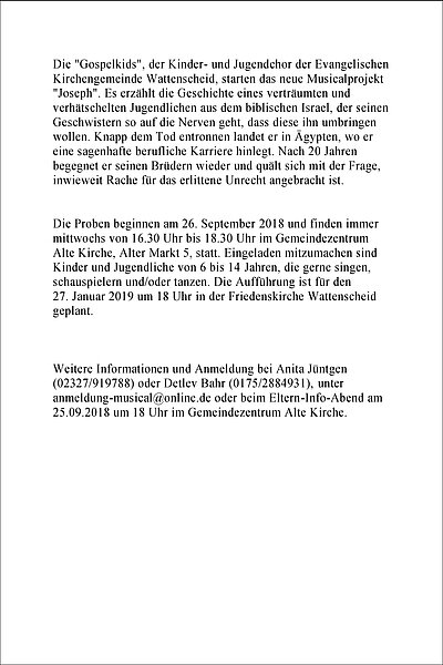 DIENSTAG 25. SEPTEMBER 2018, 18 UHR: GZ ALTE KIRCHE - "Joseph" - ELTERN-INFO-ABEND für Kindermusicalprojekt