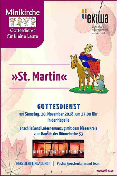 SAMSTAG, 10. NOVEMBER 2018, 17 UHR: Minikirche "Gottesdienst für kleine Leute" anschl St. Martin Laternenumzug - in der Kapelle, Höntroper Str. 35, 44869 BO-Wattenscheid-Höntrop
