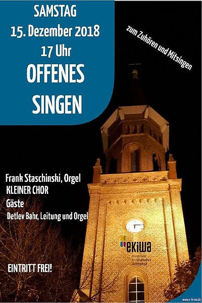Am Vorabend des 3. Advent, am 15.12.2018 um 17Uhr lädt die Ev. Kirchengemeinde Wattenscheid zum traditionellen Offenen Singen in die Friedenskirche ein.