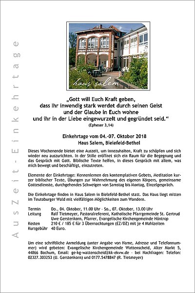 21.08.2018: 4. - 7. OKTOBER 2018: AusZeit vom Alltag im Haus Salem/Teutoburger Wald