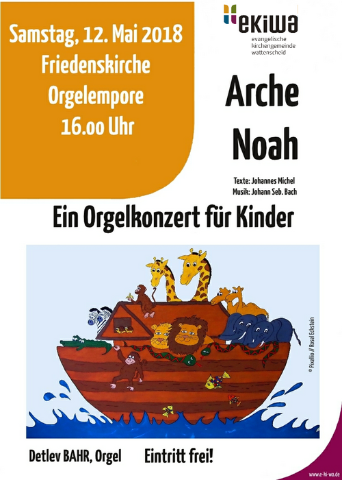 Rainer Siegel lässt Vögel durch die Kirche flattern, die Dorfbewohner über Noah und seine Familie spotten und nimmt alle Zuhörer mit hinein in die Geschichte. Die Orgel beschwört das heraufziehende Gewitter, lässt die Arche von den Tritten der Elefanten erzittern und beschreibt den Regenbogen am Ende der Geschichte. Mit der Musik von Johann Sebastian Bach, gespielt von Detlev Bahr (Kirchenmusiker e-ki-wa).