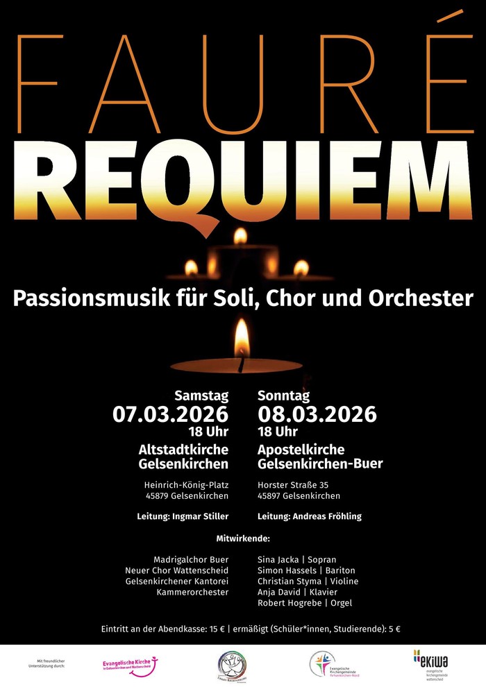 Der Neue Chor Wattenscheid, die Gelsenkirchener Kantorei und der Madrigalchor Buer laden unter der Leitung von Ingmar Stiller und Andreas Fröhling, gemeinsam mit einem Kammerorchester und Solisten herzlich zu zwei Aufführungen des Requiems von Gabriel Fauré ein.