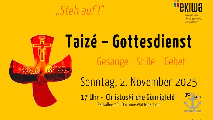 Zu einem besonderen Gottesdienst lädt die Evangelische Kirchengemeinde Wattenscheid am 2. November um 17 Uhr in die Christuskirche nach Günnigfeld ein. (Parkallee 20) Musikalisch geprägt sein wird der Gottesdienst von sehr harmonischen und fast meditativen Gesängen, die ihren Ursprung in einer Bruderschaft in dem kleinen französischen Ort Taizé haben. In den biblischen Texten wird unter dem Leitwort „Steh auf!“ Bezug genommen auf ein Altarfenster der Kirche, an deren Erbauung vor 100 Jahren gedacht wird.