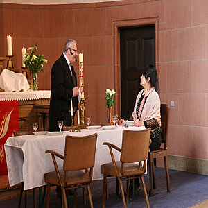Zur Freude der Gemeinde gab es auch beim Kirchweihjubiläum in Günnigfeld ein „Dinner for one“ – und zwar mitten im Gottesdienst. Fräulein Christina (gespielt von Birte Meier-Brodkorb) hatte imaginäre Gäste aus der Geschichte der Günnigfelder Gemeinde eingeladen: den ersten Pfarrer, die frühere Gemeindeschwester, einen Kantor und den Stadtbaumeister, der die Christus-Kirche ehrenamtlich entwarf. Kirchendiener Jakob (Gernot Tornes) schlüpfte in alle diese Rollen und unterhielt sich mit Fräulein Christina über die Feste im Kirchenjahr, wie sie seit 90 Jahren in der Christuskirche gefeiert werden. „The same procedure as every year“, wie es beim „Dinner for one“ heißt – der gleiche Ablauf wie jedes Jahr.