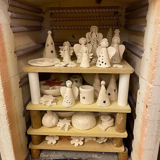 Nach Fertigstellung der Objekte werden diese nach einer gewissen Trockenzeit im Ofen gebrannt. Anschließend können die Arbeiten mit Farbe versehen und glasiert werden. Dies geschieht durch einen 2. Brennvorgang. Ein entscheidender Faktor für das Gelingen ist z. B. die Auftragsstärke der Glasur. Das kann durchaus sehr unterschiedlich sein bei verschiedenen Glasuren. So erfordert das Glasieren: dranbleiben und Erfahrungen sammeln. Wenn der Ofen nach diesem letzten Arbeitsschritt geöffnet wird, sind immer alle ganz gespannt wie die einzelnen Stücke geworden sind.